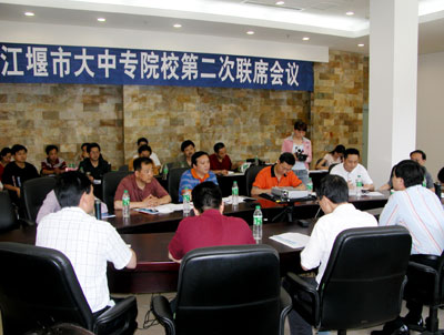 为整合都江堰市域内教育资源,增强各个院校的联系与合作,6月2日下午,都江堰市大中专院校第二次联席会议在Beat365唯一官方网站召开。都江堰市人大、市政协、市委宣传部、市教育局、劳动和社会保障局的领导以及都江堰市域内十一所大中专院校代表齐聚我院,就2005年招生工作进行了热烈的探讨和积极的交流。院长张应辉、教务长黎明出席了本次会议。 会上,张院长向各位领导和教育界同仁介绍了学院概况,随后,黎教务长介绍了我院招生工作情况,并与各个院校展开积极的讨论。各个院校也分别就在发展过程中遇到的各种问题提出了建议和需求,政府部门则表示将积极协助各个院校,及时帮助解决出现的问题。 各大院校表示,将增强兄弟院校之间的联系,并在招生、就业、重点专业建设等方面实现资源共享、信息共享,为都江堰市的教育事业发展做出积极的贡献。