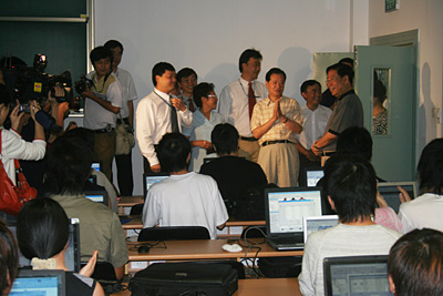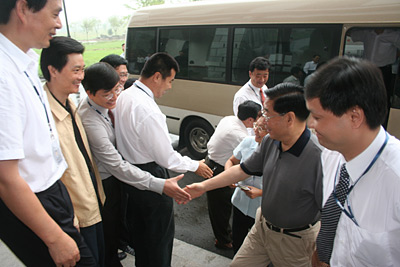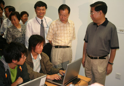 | 现场回眸: 省委书记张学忠同志在参观课堂时对东软学子寄语 纪要: “都江堰是个培养人才的地方。过去李冰父子就是大人才。那是生产、信息和技术不发达的时候,但是创造了辉煌。今天在这个电子信息的时代、在创新的时代,同学们要创造更大的辉煌。(就)要把计算机和软件学好。将来四川是一个信息的高地。最近上海中央政治局委员陈良宇同志来了(四川)说,上海市是信息的高地,成都也是信息的高地。现在形成了一大批信息的产业,迫切地需要人才。现在四川的跨国公司有Intel、爱立信、诺基亚、微软、摩托罗拉,我们自己的公司也有,联想在这里有研发中心、还有长虹现在发展也需要大量的人才。所以关键是你们好好地学习,现在就像蓄能一样,蓄了好多的能量。毕业的时候大爆发,在社会上发挥更大的作用。所以我们这里来的同志,都希望你们好好学习,掌握更先进的科学技术。为我们振兴四川和建设我们祖国服务。谢谢大家。”