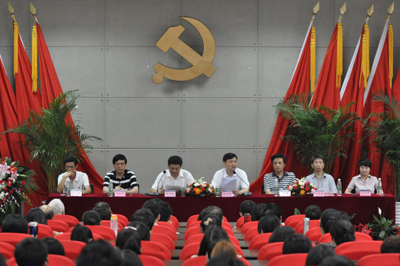 6月28日下午,在中国共产党成立九十周年之际,学院党委在A3国际报告厅隆重集会,召开庆祝中国共产党成立90周年暨先进表彰大会。参加这次大会的有学院党委书记、院长张应辉教授,党委副书记、副院长张宪民,党委委员、副院长刘宏,党委委员、党委办公室兼院长办公室主任易胜华,党委委员、党委组织部兼人力资源部部长刘明理,党委委员、学工部兼保卫部部长程学良,党委委员、党委宣传部兼品牌经营部部长陈旭辉及学院全体教职员工党员和部分学生党员。