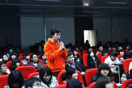 周宏桥先生首先邀请前来参加讲座的学生现场设计一款针对3A级景区的(移动)互联网创新产品。在现场,同学们积极踊跃地发言,讲述自己对开发这款产品的创意和设想,内容丰富而精彩,博得了全场阵阵掌声。互动结束时,周宏桥先生将自己的大作《就这么做创新》送给了发言最精彩的同学。