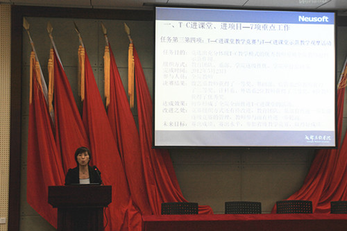 院长助理、教务部部长康桂花对学院2011-2012学年教学运行进行了总结。学院2011-2012年度教学运行工作着重实践教学的检查,并完成了T-C进课堂、进项目,专业建设,课程建设,教研教改以及实践教学管理5个方面的15项重要工作。在此基础上,她也提出了学院2012-2013年度教学运行的16项工作要点,并号召全体教职工齐心协力,一同做好学院新学年的各项教学工作。