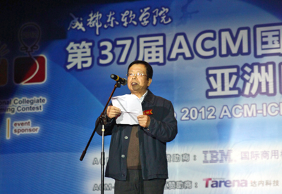 闭幕式上,ACM国际大学生程序设计竞赛主席黄金雄教授作了重要讲话。他对成东软学院承办此次ACM大赛表示衷心感谢,并高度肯定了学院在此次大赛中付出的辛劳和汗水。他提到毛泽东主席的“幸福大道”观以及曾任美国总统的罗斯福说过的“人生最大幸福和恩赐就是做你自己喜欢做的事,并且认真去做”,并用两位伟人的话激励在座学生勇敢秀出自己的才能,发扬ACM大赛的精神,在人生舞台上创造辉煌。