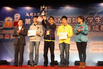 最后,最激动人心的时刻到了:本届大赛的冠、亚、季军名单揭晓。荣获季军的代表队为浙江大学,学院财务总监陈云华与达内科技人才服务中心直辖区副总经理李旻为他们颁奖;获得亚军的代表队为北京大学, ACM中国区委员会秘书长周维民教授和学院副院长张辉教授为他们颁奖;而获得最高奖项冠军的代表队是清华大学,ACM国际大学生程序设计竞赛主席黄金雄教授、IBM中国区关系大学经理周恩昌及学院副院长曹云凤教授为冠军队颁奖。至此,大赛闭幕式暨颁奖典礼圆满结束。