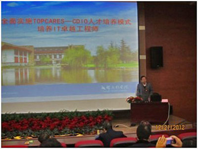 曹副院长结合学院实际,对如何实现学院内涵式发展,做好发展的顶层设计做了详细阐述。曹副院长指出,学院在总结多年来构建IT应用型专业教学体系经验做法的基础上,依据培养应用型人才“TOPCARES——东软教育对学生最高关注”八大能力指标,制定了T—C一体化专业人才培养方案,实施了理论学期课程T—C项目实训体系和的实践学期T—C项目实训体系,形成了以项目实训为手段,以专业核心能力培养为主线,贯穿大学全程的T—C项目实训体系,全面实施了T—C人才培养新模式。他强调,具有东软学院特色的TOPCARES—CDIO人才培养模式的构建实施是实现学院内涵式发展,培养IT卓越工程师,创建高水平IT应用型大学的重大举措所在。此外,曹副院长阐明了新型基层学术组织专业教育管理团队的组建对学院内涵式发展的组织保障作用,以及全面做好教学工作对实现学院顶层设计目标定位的保证作用。曹副院长用精彩的内容和风趣的语言,赢得了与会领导和专家的认同和赞赏。