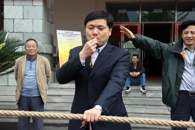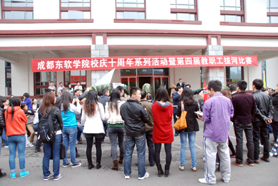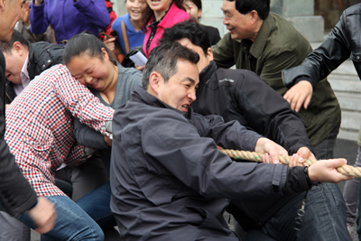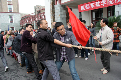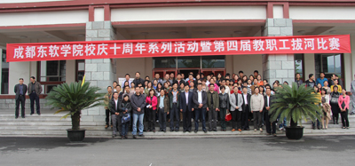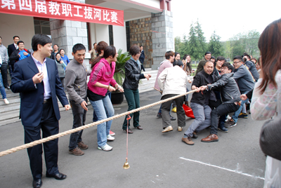 为迎接学院十周年校庆,丰富全院教职员工的文化生活,学院工会于4月至5月期间举行校庆十周年系列活动暨第四届教职工拔河比赛。4月11日中午,学院教职员工在A2楼前小广场举行了第一场别开生面的拔河比赛。学院党委书记、院长张应辉教授,学院副院长刘宏,学院党委副书记张宪民,财务总监陈云华以及学院各系部主要领导观看了比赛。此次大赛的裁判长为学院党委书记、院长张应辉教授。