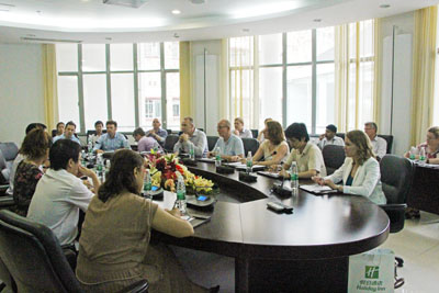学院领导与来访客人在学院第一会议室举行了座谈会。学院副院长张辉教授向来宾表示了热烈欢迎,并以中国目前经济转型和成都地方经济发展趋势引入,详细介绍了学院的办学背景、办学理念、办学特色和各项教育教学改革,并分享了学院自建校至今所取得一系列教育教学成果,赢得了来访客人的一致认可。